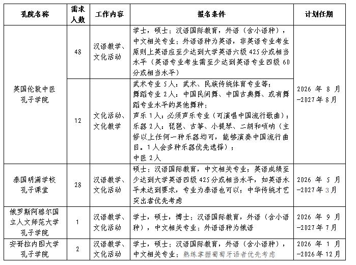 为满足我校英国伦敦中医孔子学院、安哥拉内图大学孔子学院、阿穆尔国立人文师范大学孔子学院、泰国芭堤雅明满学校孔子课堂的教学需求,提高孔子学院的办学质量,根据语合中心《资助中外机构中文教育合作项目派遣志愿者出国任教管理办法(修订)》及《哈尔滨师范大学孔子学院国际中文教育志愿者选派与管理办法(试行)》的相关要求,现面向全国招募2026年度孔子学院国际中文教育志愿者(以下简称志愿者),具体事宜通知如下:
